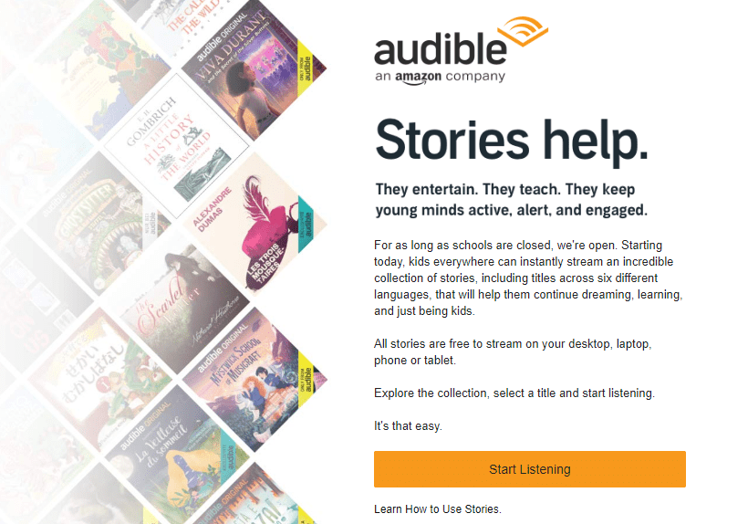 Some really amazing free resources are being shared from lots of educational sites. Audible books is offering numerous free online stories for anyone who wants to listen, at this link here.