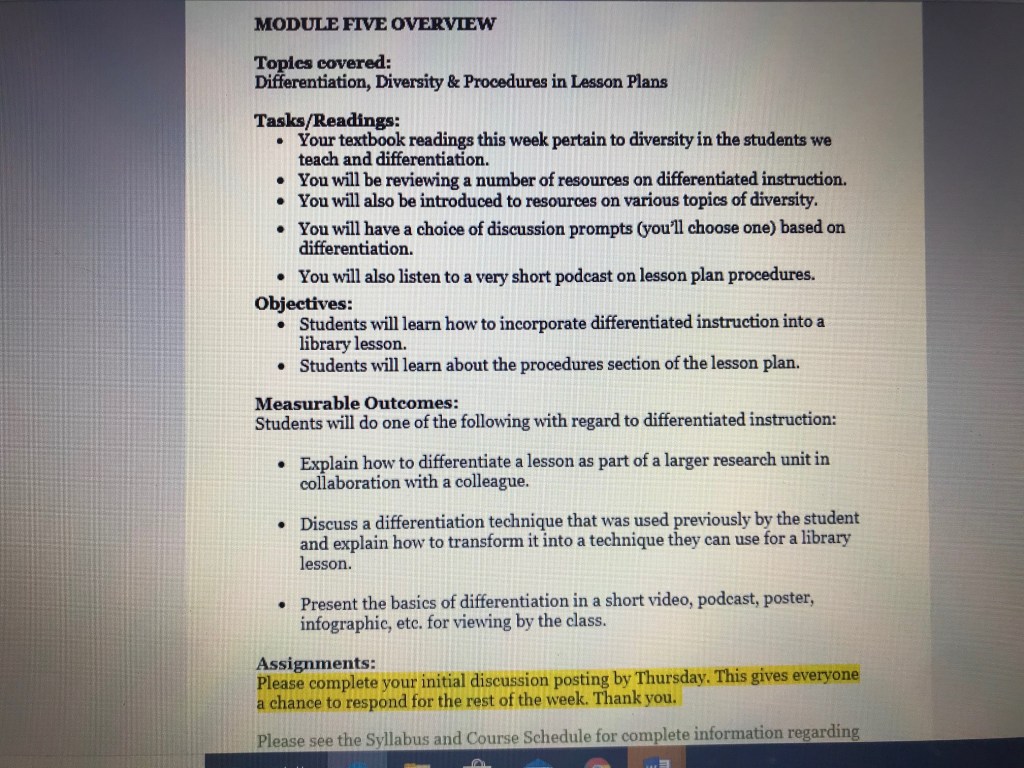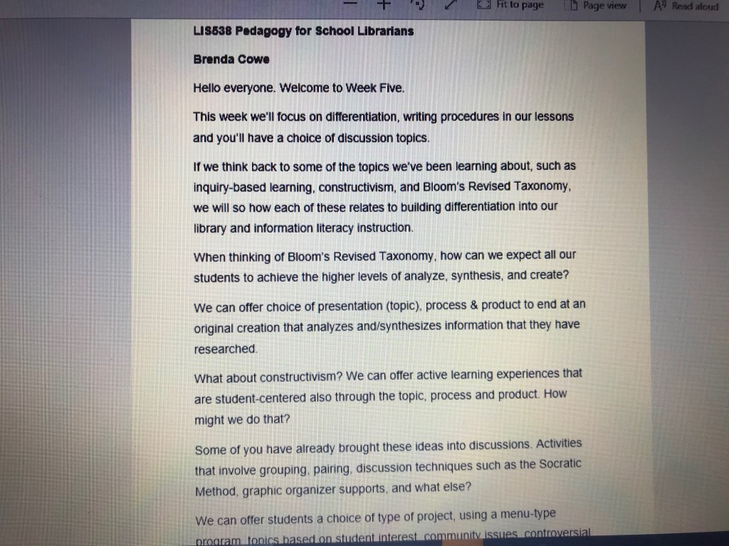 One thing that my students commented on regularly was the fact that they liked having choices when completing a discussion prompt or an assignment. Not all assignments can include choice but when I could do it, I tried to. This was particularly helpful in my situation because I had veteran teachers getting the certification, students who were already in a librarian job, and some students who had no experience in education at all. It was hard to meet their needs without offering choice whenever possible.
